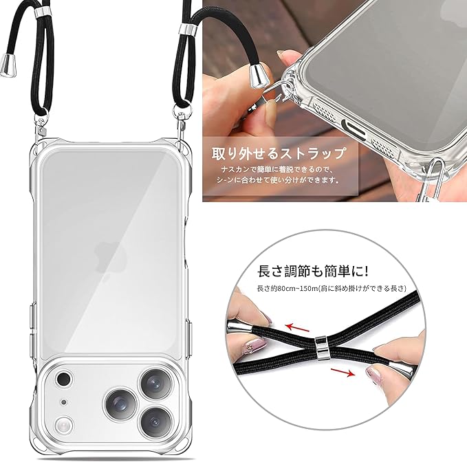 iPhone 17 Pro 用 ケース クリア ショルダー アイフォン17 Pro 用 スマホケース 携帯カバー 肩掛け 斜めかけ 縄掛けケース 透明 耐衝撃 TPU 薄型 軽量 紐付き 織りストラップ付き ネックストラップ 長さ調整可能 取り外し可能 落下防止 ワイヤレス充電対応 (クリア) | KAZESHOP