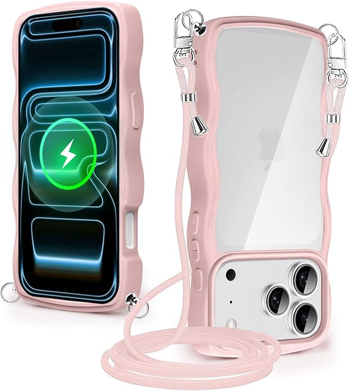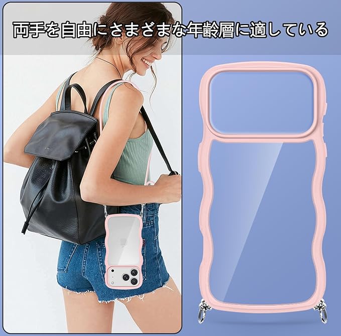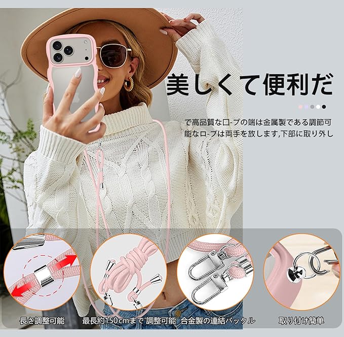 iPhone 17 Pro 用 ケース クリア ショルダー 耐衝撃 かわいい 人気 アイフォン 17 Pro 用 カバー 透明 スマホケース 薄型 軽量 首かけ 肩掛け 縄掛けケース ストラップ付き 取り外し可能 長さ調整可能 ワイヤレス充電対応(ピンク) | KAZESHOP