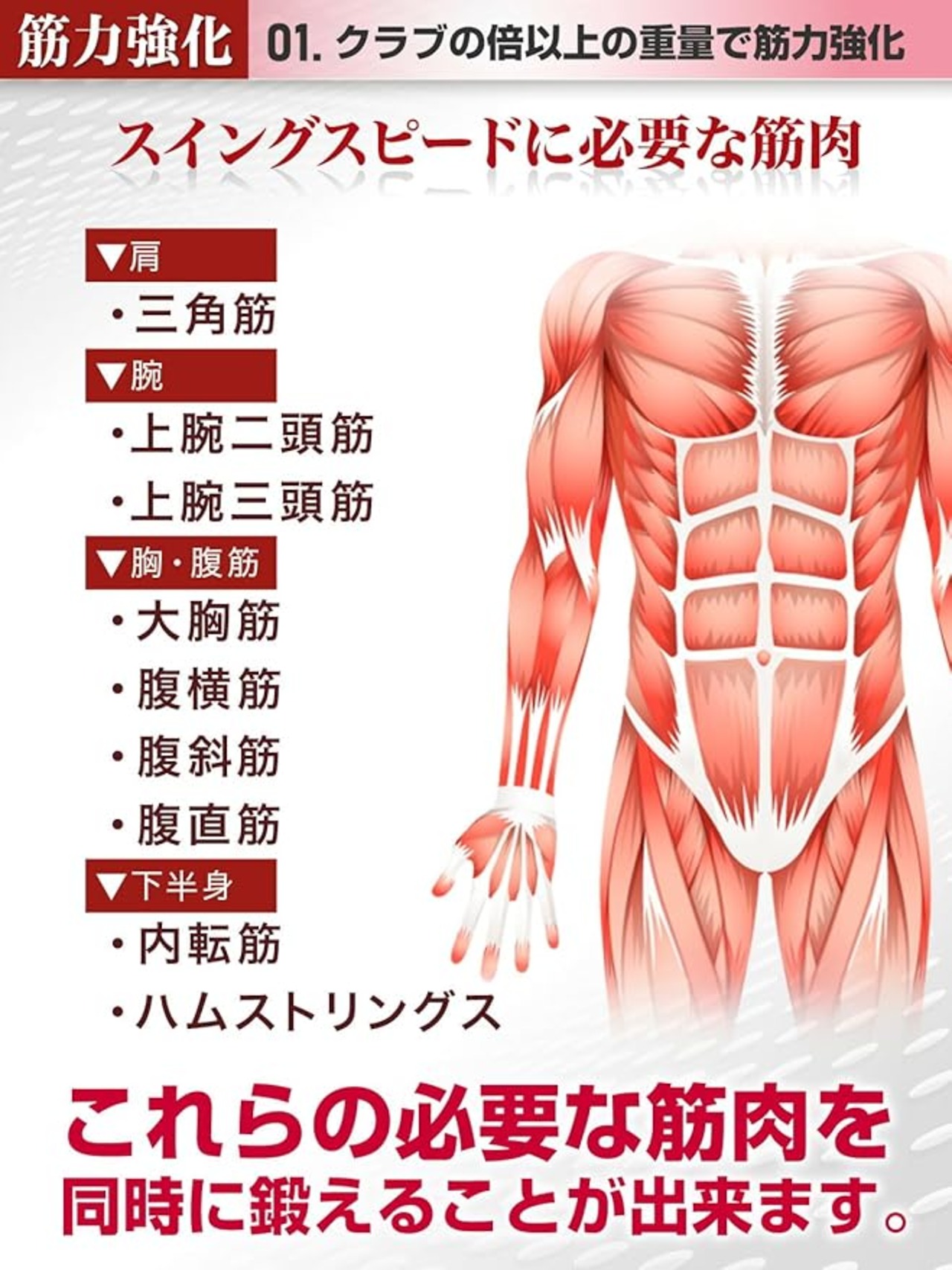 ️♂️【クラブの倍以上の重量で筋力強化】長さは平均的なドライバーより短めですが重量は倍以上の550gもあります。一般的なドライバーを振るよりも大きな筋力アップを期待できます。スイングスピードに必要な筋肉「上腕二頭筋」「上腕三頭筋」を同時に鍛えることができます。