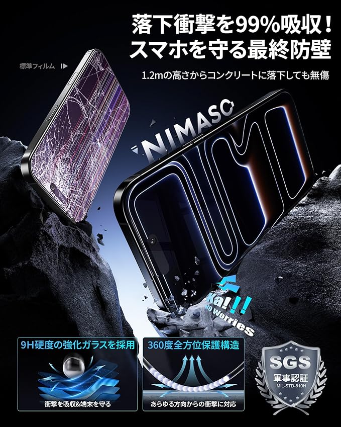 「9H硬度・飛散防止」米軍規格「MIL-STD-810H」に準拠(認証番号:SZXEC23002005001)。9H硬度のガラスを採用。5000回の耐摩耗テストをクリア、鍵などの鋭いものにぶつかっても傷がつきません!あいふぉん17プロの画面をしっかり保護します。飛散防止加工により、万一割れてもガラス破片が飛び散ることなく安心です。