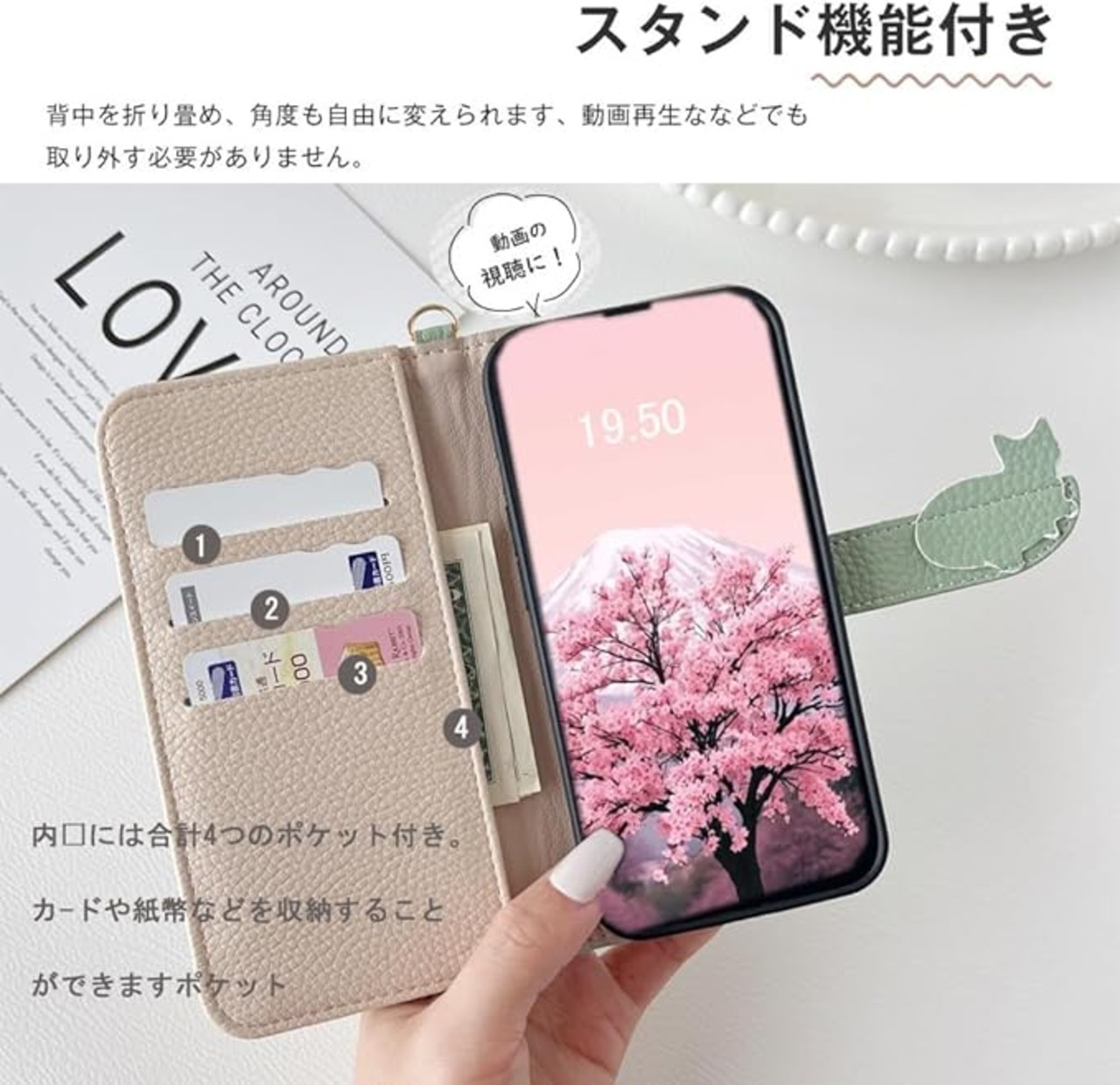 洗練された外観デザインライチシェルテクスチャ:厳選された高品質PU素材を使用し、表面には繊細なライチテクスチャがエンボス加工されています。柔らかく快適な手触りで、滑りにくく指紋がつきにくいだけでなく、全体的な質感も向上しています。癒しの子猫柄:マグネット式バックルには、のんびりとした可愛い猫が描かれています。この柄は耐摩耗性があり、色褪せません。鮮やかな癒し効果で、携帯電話に軽快さと可愛らしさを添えます。実用的で多機能なデザインスタンド機能:携帯電話ケースは簡単に折りたたむことができ、スタンドとして使用できます。お好みの角度に調整でき、両手が自由になり、読書や動画鑑賞を快適に楽しめます。保護機能:携帯電話ケースは、携帯電話を全面的に保護し、耐衝撃性と耐傷性を備え、埃による画面の汚染を効果的に防ぎます。落下時の衝撃を効果的に分散し、携帯電話の損傷を効果的に防ぎます。カード収納機能:携帯電話ケースには3つのカードスロットと紙幣クリップがあり、よく使うカード3枚と少額の現金を収納できます。外出時の支払いやカードスワイプが便利です。優れた職人技正確な穴位置:正確なカットにより、すべての機能(カメラ、スピーカー、ポート、ボタン)に完全にアクセスできます。