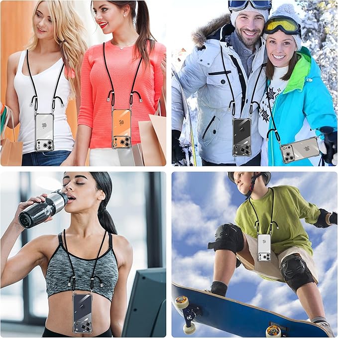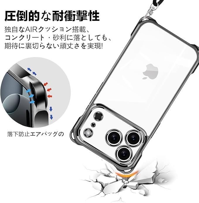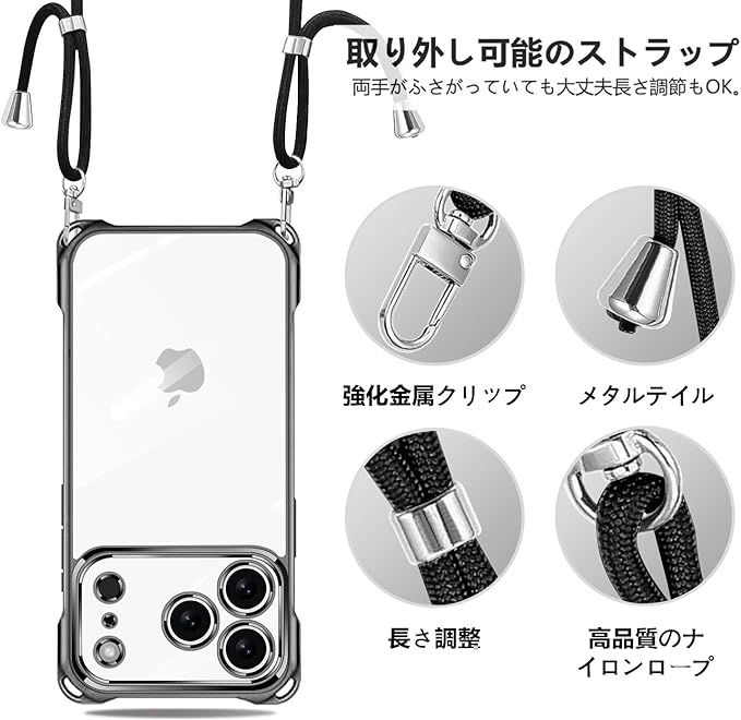 iPhone 17 Pro Max 用 ケース クリア ショルダー iphone17pro max 用 スマホケース アイフォン17ProMax カバー 肩掛け 斜めかけ 縄掛け 透明 TPU 薄型 軽量 耐衝撃 ケース 紐付き 斜めがけ 織りストラップ付き ネックストラップ ショルダー 縦/横 2WAY 長さ調整可能 取り外し可能 落下防止 紛失防止 ワイヤレス充電対応 (ブラック) | KAZESHOP