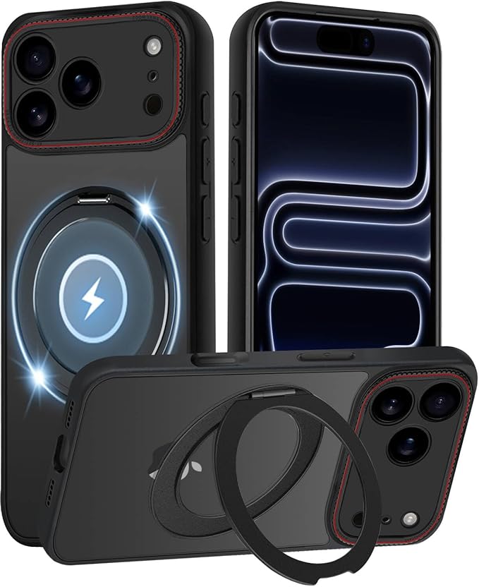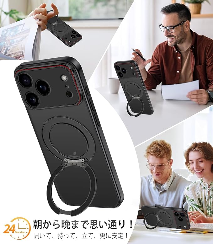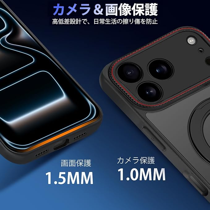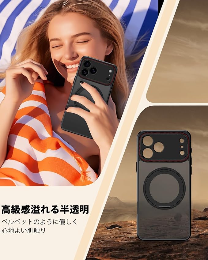 iPhone 17 Pro ケース 半クリア リング付き 360 回転スタンド MagSafe対応 ワイアレス充電対応 耐衝撃 アイフォン 17 Pro カバー 軽量 薄型 人気 iPhone17Proスマホケース 半透明 PC + TPU 車載ホルダー対応 (ブラック) | KAZESHOP