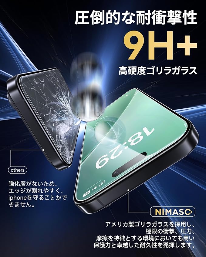 「9H硬度超え・スクラッチ防止・飛散防止」本製品はアメリカ製ゴリラガラス(Corning)を採用しており、MIL-STD-810H軍用規格テストをクリア済、硬さは9Hを超えます。鞄やポケットのなかで、鍵などの鋭いものにぶつかっても傷が付きにくいです。予期せぬ衝撃からアイフォン17promaxの画面を最大限に保護します。飛散防止加工により、万が一割れてもガラス破片が飛び散ることなく安心して使えます。