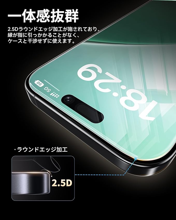 「指紋防止・ケースと相性抜群」耐水性と耐油性に優れたナノAFコーティングにより、指紋、水滴、汗、油などが付着しても簡単に拭き取ることができるので、いつもきれいな状態を保てます。また、2.5Dラウンドエッジ加工が施されていることで、手に引っかかる感じがありません。本体の縁まで適度なスペースを残しており、装着後もスマホのデザインを損なわず、ケースとの相性も抜群です。