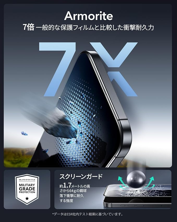 【超強力保護】ESR いPhone17Pro 保護フィルムの超耐久強化ガラスは最大約50kgの圧力に耐え、落下や衝撃、キズから画面をしっかり保護します
