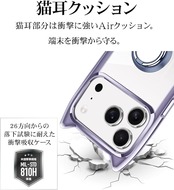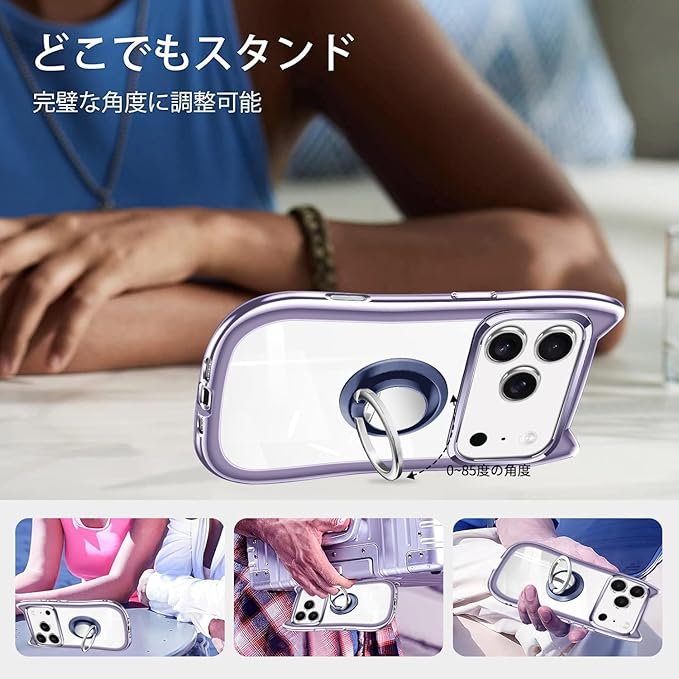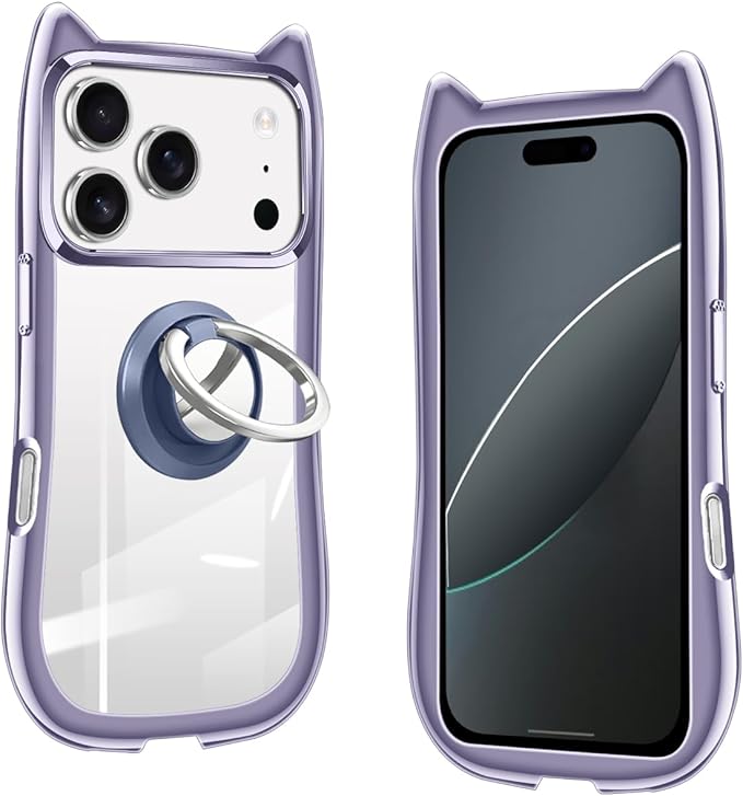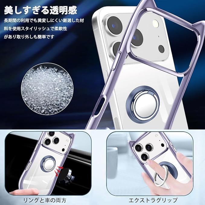 iPhone 17 Pro 専用 ケース クリア カバー TPU 猫耳 リング付き リングホルダ かわいい おしゃれ スタンド付き ストラップホール アイフォン17プロ スマホケース 多機能 全面保護 落下防止(パープル) | KAZESHOP