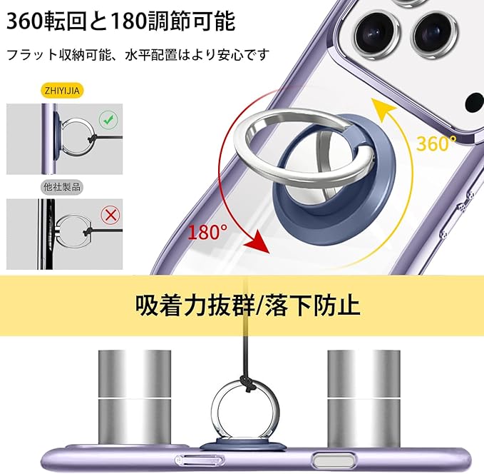 【リング付き機能】ケースを横置きにするとスタンド機能になり、持たず動画鑑賞などを楽しむことができます。リングは360度回転可能、185角度調節可能。一指着る式で、指がリングに通り抜け、片手で携帯を操作でき、落下防止します。