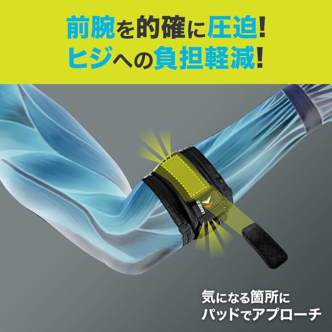 【ヒジへ伝わる負担を軽減】ストラップとエルボーパッドによる圧迫でヒジへの負担を軽減。パッド位置の調節により、ヒジの内側・外側どちらにも対応します。