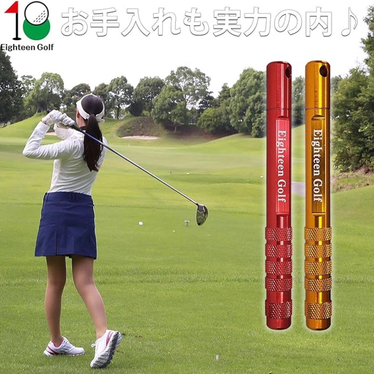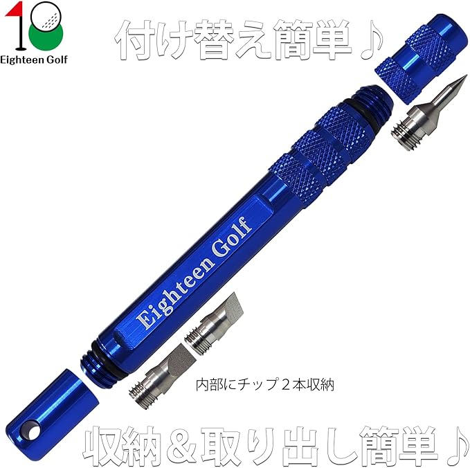 アイアンやウェッジのスピン性能、落ちていませんか? 「Eighteen Golf ゴルフシャープナー」は、クラブフェースの溝をしっかり研磨して、スピン性能と操作性を取り戻すプロ仕様ツール 付属の3種類の交換チップを使い分けて、あらゆる溝形状に対応可能 チップは高硬度ステンレス製で耐久性も抜群 滑りにくいローレット加工付きで扱いやすい カラーバリエーションも5色展開で、自分のスタイルに合わせて選べる