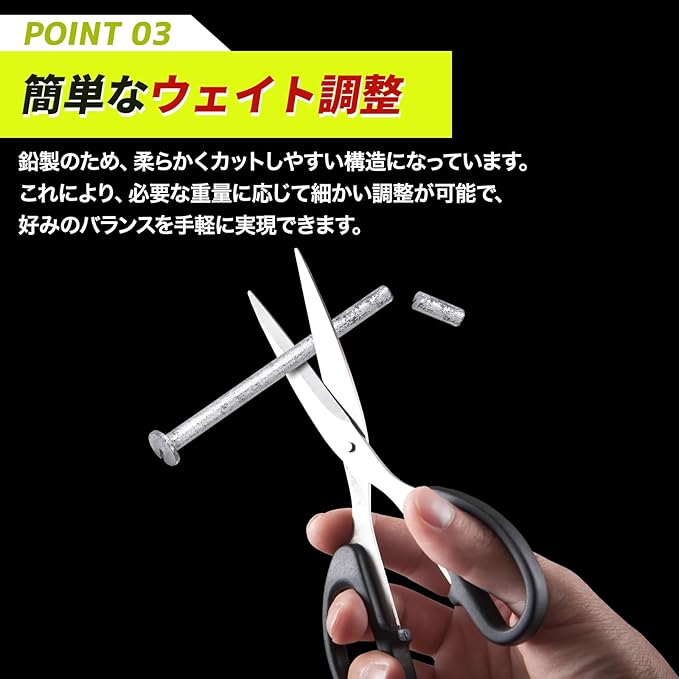 【簡単なウェイト調整】鉛製のため、柔らかくカットしやすい構造になっています。これにより、必要な重量に応じて細かい調整が可能で、好みのバランスを手軽に実現できます。