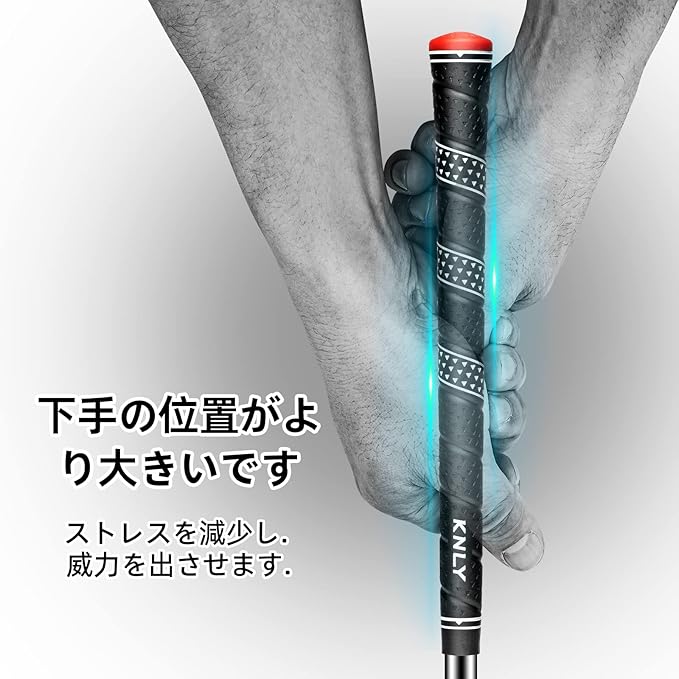 【科学的テーパ設計】本グリップ下手の位置がより大きいです。テーパ減少は手に対する圧力を減少し、スイング時に威力を出させます