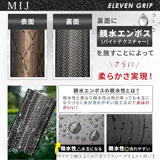 また、ハイドロプレーニング現象を防ぎグリッププレッシャーをできるだけ一定にできます。