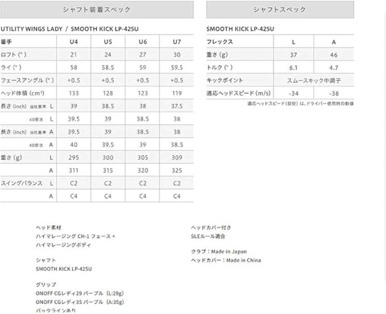 [シャフト]SMOOTH KICK LP-425U [フレックス]A [長さ]39.5インチ [シャフト重量]46g [バランス]C4 [シャフトトルク]4.7 [キックポイント]スムースキック中調子