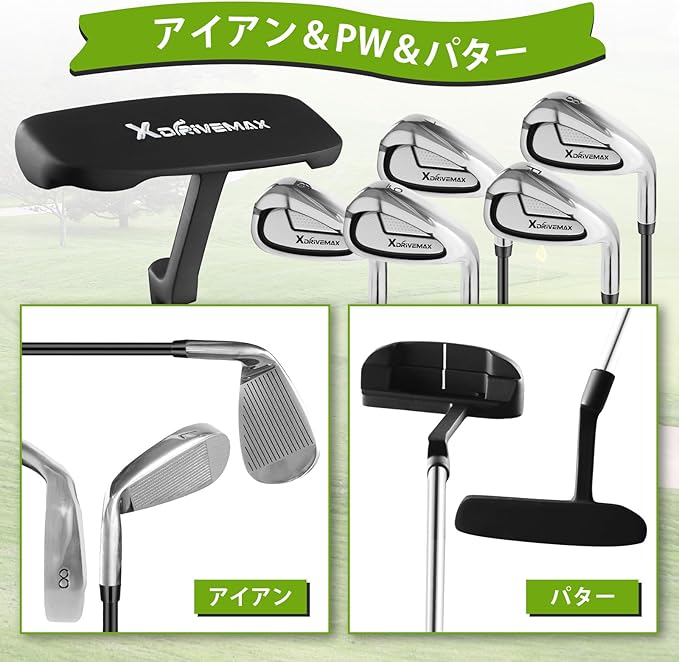 【ワンストップで安心のセットアップ】軽量ゴルフバッグには、1 番ウッド、3 番ウッド、5 番ハイブリッド、6~9 番アイアン、PW(ピッチングウェッジ)、そしてパターが同梱されています。手間をかけて組み合わせる必要がなく、初心者に最適です。1 番、3 番、5 番のクラブには専用のヘッドカバーが付属し、持ち運び時のクラブの安全を確保します。