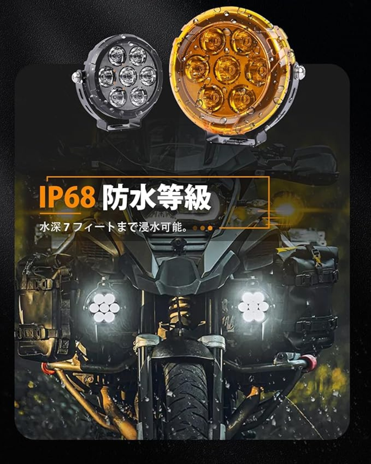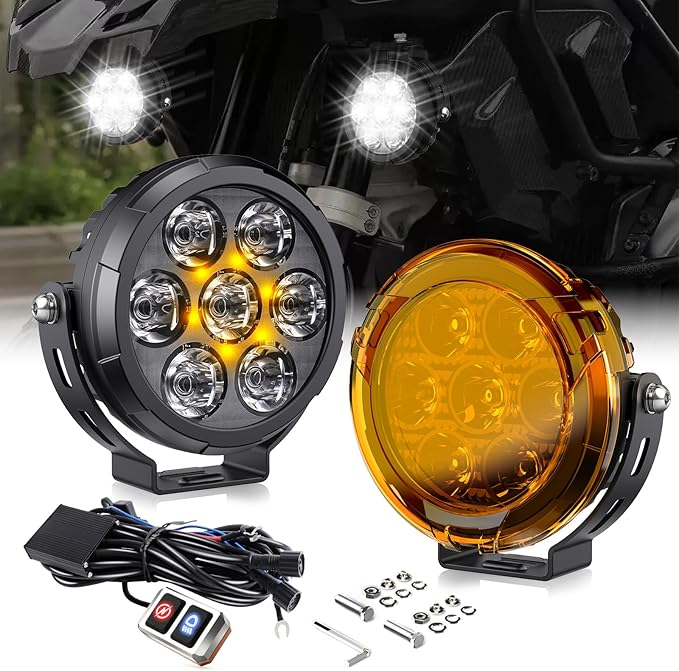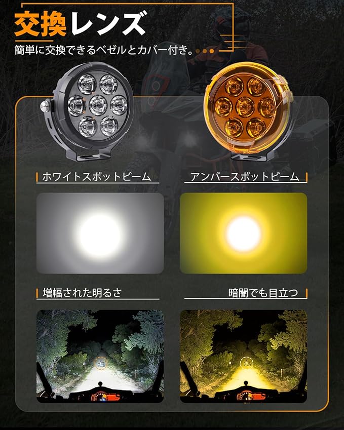 【夜間走行の安全性向上のため視認性向上】当社のバイク用フォグランプには、悪天候でも優れた性能を発揮する交換可能な琥珀色のレンズが付属しています。これらの補助ライトは夜間に前方の道路を明るく照らし、夜間のトレイルライディングアドベンチャー中に道路上の他のドライバーからより目立つようになります。