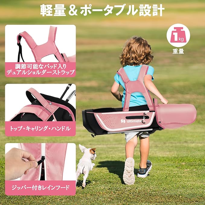【持ち運びや収納に便利】軽量デザインと調節可能なパッド入りデュアルショルダーストラップにより、お子様でも簡単にクラブを持ち運ぶことができます。