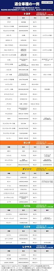 ■ レクサス LEXSUS UX250H 200 H30.11~R4.6 MZAH1# MZAA1# / NX R3.10~ AAZA2# AAZH2# / LX600 R4.1~ VJA310 / UX250H 200 R4.7~ MZAA10 / LBX R5.11~ MAYH10 MAYH15 ■ダイハツ DAIHATU アトレー R3.12~ s700v S700 S710 / トール R2.9~ M900S M910S / ハイゼット カーゴ R3.12~ s700v S700 S710 /ハイゼット トラック R3.12~ S500P S510P / ムーヴ キャンバス R4.7~ LA850S LA860S / タント カスタム R4.9~ LA650S LA660S ■スズキ SUZUKI ランディ R4.8~ MZRA90C MZRA95C ZWR90C ZWR95C / スペーシア スペーシアカスタム R5.12~ MK#4S / ソリオ MA37S MAD7S R5.12~