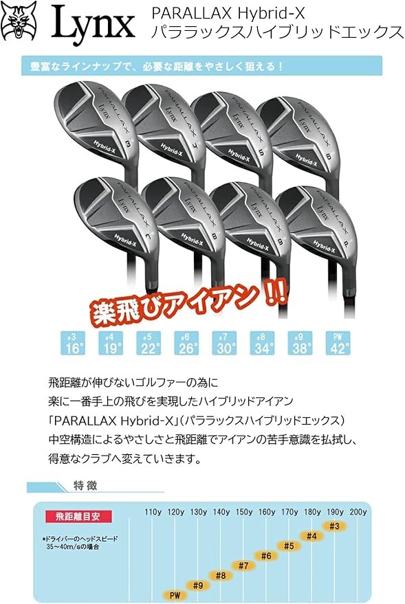 単品販売(バラ売り) ※画像はセットを使用しております。スペック等をご確認ください。 ※セット販売はございません。 飛距離が伸びないゴルファーの為に、楽に一番手上の飛びを実現した ハイブリッドアイアン「PARALLAX Hybrid-X」(パララックスハイブリッドエックス) 中空構造によるやさしさと飛距離でアイアンの苦手意識を払拭し、得意なクラブへ変えていきます。 アイアンは重心深度が浅い為、ボールを上げるにはパワーが必要ですが ユーティリティー形状は重心深度が深い為、やさしくキャリーを伸ばすことができます。 ・ラウンドソール、広いスイートエリア あらゆるアンジュレーションに対応できるラウンドソール形状を採用しました。 地面との摩擦抵抗を大幅に抑え、安定したショットが可能になります。 ・ソールがすべる! 通常のアイアンはダウンブローに打つのでダフったりトップしたりミスショットが出やすいですが、 ハイブリッド形状はレベルブローに打てるのでミスが出にくいです。 さらにリーディングエッジが丸くソールが広いので、ラフからのショットに効果があります。