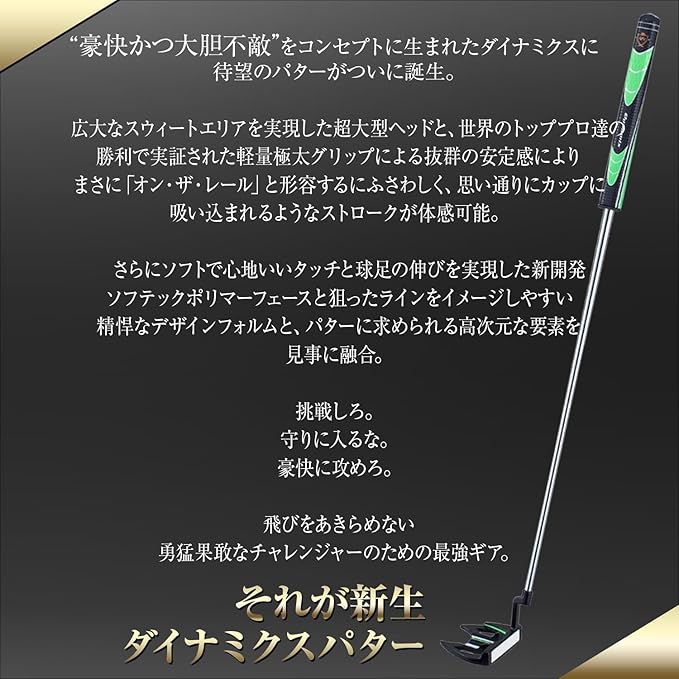 果敢に狙い、豪快にカップイン!! 兜をモチーフにデザインされた超大型マレット形状ヘッドにより、慣性モーメントが高く、抜群の安定感を発揮。またフェースには柔らかくマイルドなタッチと打感が特徴のソフテックポリマーフェースを採用。 さらに世界中のツアーでもトッププロらの幾多の勝利で人気の極太グリップを採用。吸い付くように手に馴染んで握りやすい極太グリップがストロークの安定性を大幅に向上させ、狙い通りのラインをトレース可能。しかもこの内容でお求めやすいこの破格を実現しました。