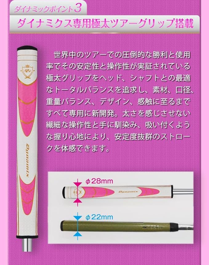 カワイさだけじゃない!高い機能性も追求した本格派のレディスパターが登場!! 女性にも優しい超大型マレット型ヘッドにより慣性モーメントが高く、抜群の安定感を発揮。またフェースには柔らかくマイルドなタッチと打感が気持ちいい新開発ソフテックポリマーフェースを採用。 さらに世界中のツアーでもトッププロらの幾多の勝利で人気の極太グリップを採用。吸い付くように手に馴染んで握りやすい極太グリップがストロークの安定性を大幅に向上させ、狙い通りのラインをトレース可能。 高いスペックはそのままに、オトナの女性らしさを醸し出すオシャレでカッコカワイイ!をコンセプトにしたパールホワイトと、ショッキングピンクのカラーリングを身に纏った、性能とデザインを兼ね備えたレディス専用モデルにして、お求めやすい破格を実現しました。