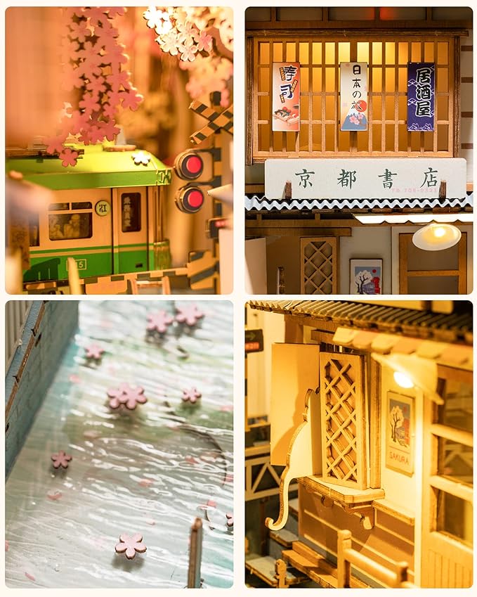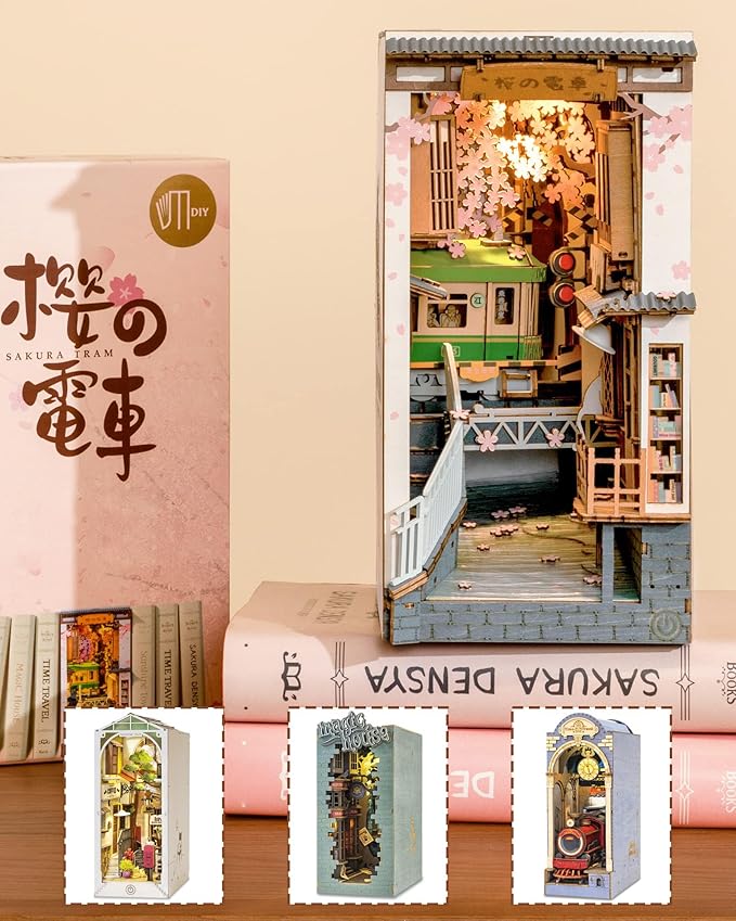 ROBOTIME ブックヌック キット 立体パズルで作る「桜の電車」- 桜咲く駅の世界を再現!LED内蔵 3Dウッドパズル ブックヌックシリーズ 本立て ブックエンド機能付き 大人も子供も楽しめる木製ミニチュア キット 和風 インテリア雑貨 手作り DIY クラフト 誕生日 記念日プレゼントに最適 | KAZESHOP