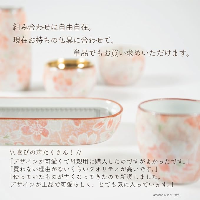 花立、灯立、寝かせる線香皿、茶湯器、仏器のセットでのご用意があります。おりんや香炉など、同一の柄のシリーズも取り揃えているため、統一感のあるお仏壇を演出できます。