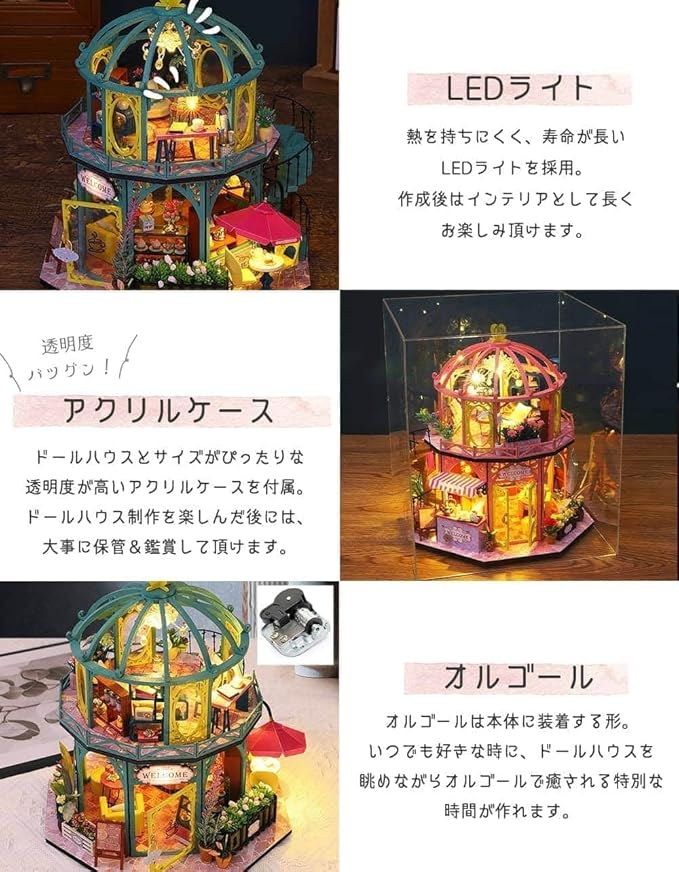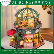 moin moin ドールハウス ミニチュア 手作りキット セット 1/24 スケール 【 英語 説明書 】 花屋さん カフェ フラワー ショップ ビニールハウス 二階建て 円形 グリーン LEDライト + アクリルケース + オルゴール 2408dh426 | KAZESHOP