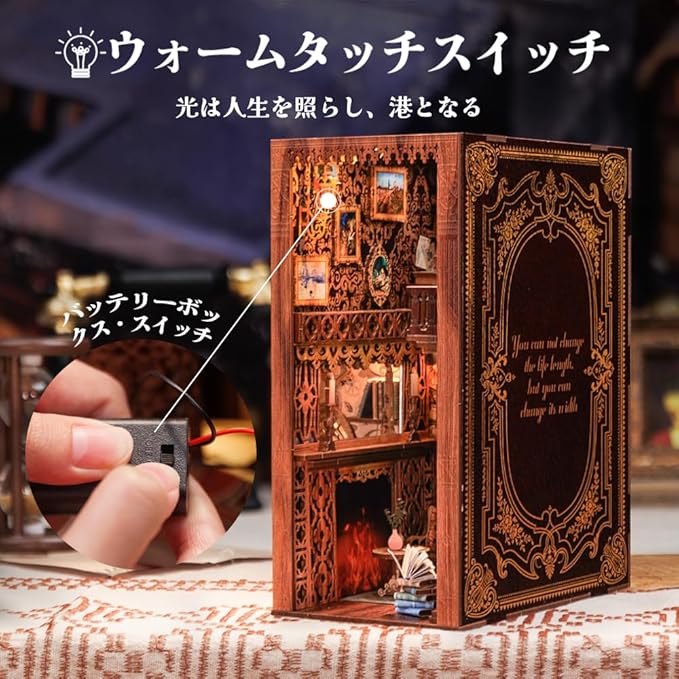 【木製ドールハウス】ブックヌックシリーズは高品質の輸入木材から丁寧に作られ、優れた職人技とデザインを誇ります. 木材の厚み2.5mmと耐久性により、時の試練に耐え、長くお使いいただけます、ドールハウスのミニチュアキットに使われている材料はとても安全です、そのため、毎日の使用中に簡単に破損することはありませんのでご安心ください. これは単なる実用的なドールハウスキットではありません、美しさと機能性を兼ね備えた芸術作品でもあります