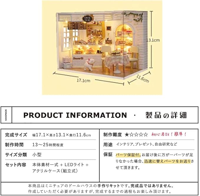 【完成サイズ】 本体:幅17 高さ13.1 奥行11.5cm アクリルケース:本体と同じ 【サイズ分類】 小型 【制作時間】 13~25時間 【制作難易度】 ★☆☆☆☆(初心者OK!簡単!) 【セット内容】 素材一式&LEDライト&ケース付 【保証】:パーツ保証付。お届け後に万が一パーツが足りなかった場合、迅速に替えパーツをお送りさせて頂きます。