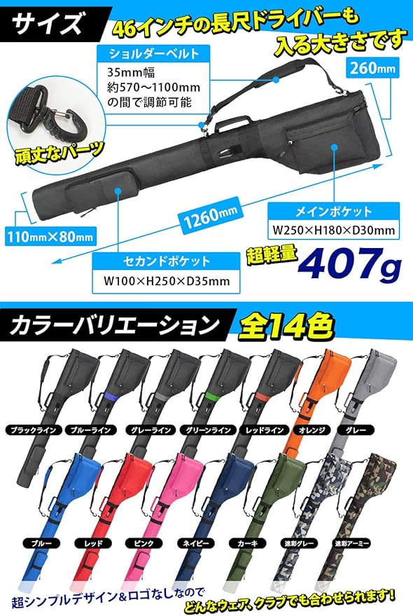 ✅【 大容量の2ポケットで収納力2倍 】ヘッド側のメインポケットはマチ付きで長財布もすっぽり。グリップ側のセカンドポケットは小3.5mmのマチあり!成人男性標準サイズのウインドブレーカーが余裕で収納。ポケット表面にティーホルダーあり。