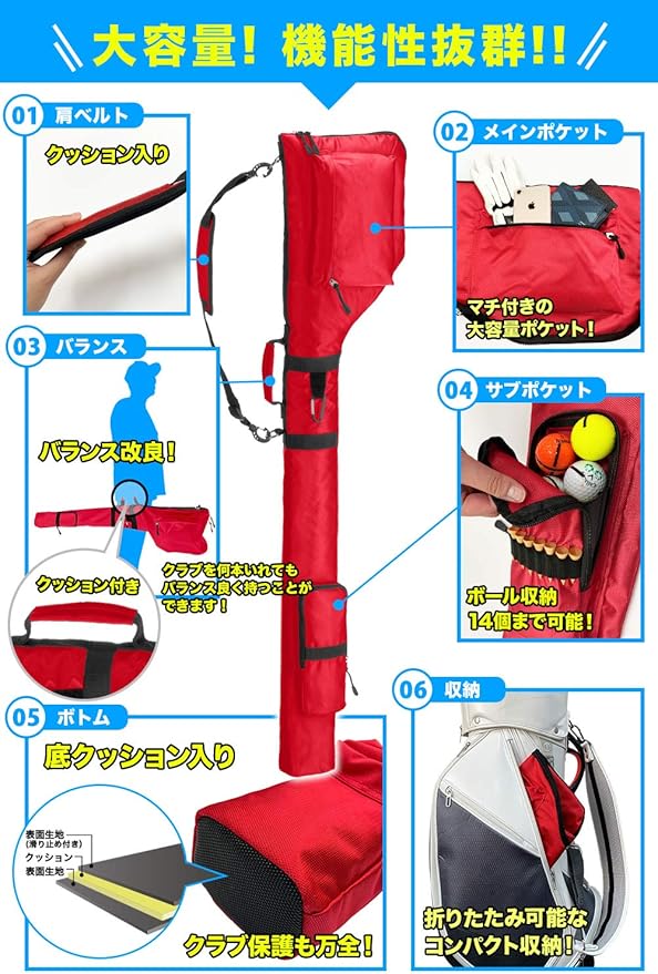 ✅【 超軽量・利便性抜群 】本体約326gと軽量なのにゴルフクラブは7本以上収納できるタフさ。利便性を追求しマジックテープ式のグローブホルダーとサンバイザーをかけたり何でも使用できるカラビナ付。持ち手&ベルトにはクッション装備!
