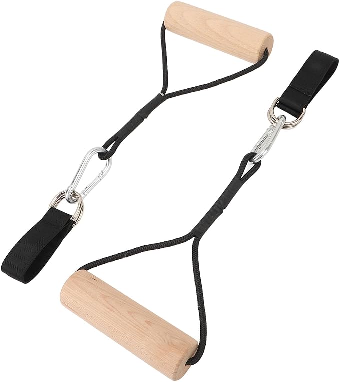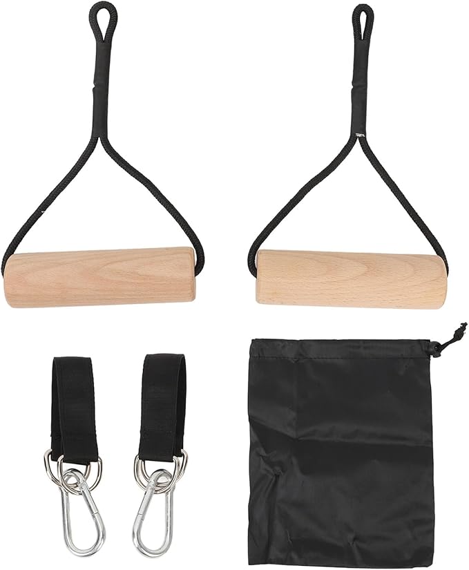 【商品仕様】材質: ブナ材 + ポリエステル + 鉄;耐荷重: 200kg;パッケージリスト: 2 木の棒、2 吊り下げストラップ、1 収納袋。