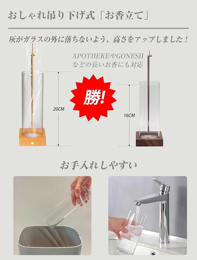 【灰が散らばらない】このお香立ては、通常のものよりも高いガラスカップが付属しており、お香が最後まで燃焼しても灰が外に落ちることはありません。より快適で安心した香道体験を提供します