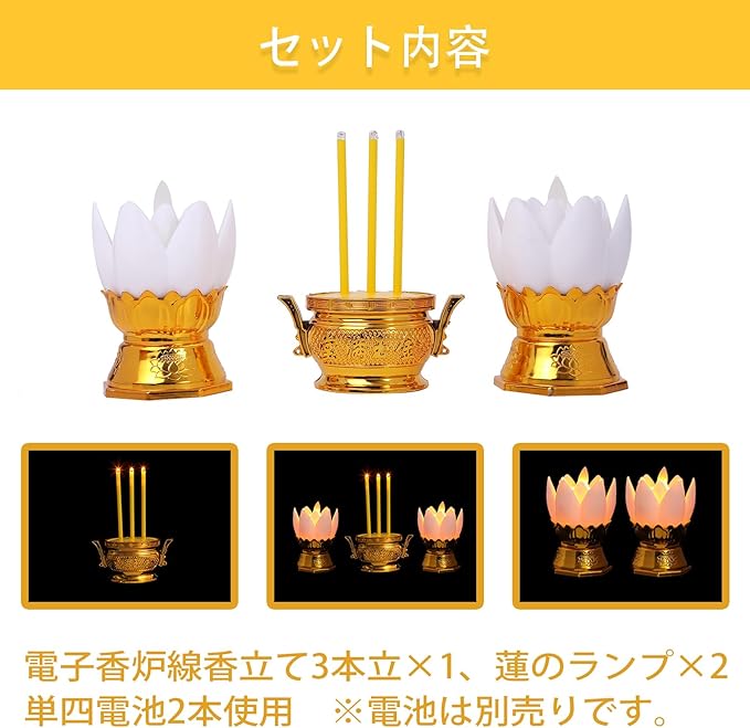 【セット内容】電子香炉 御線香立て 3本立 1、蓮のランプ 1 単四電池各2本使用※電池は別売りです。