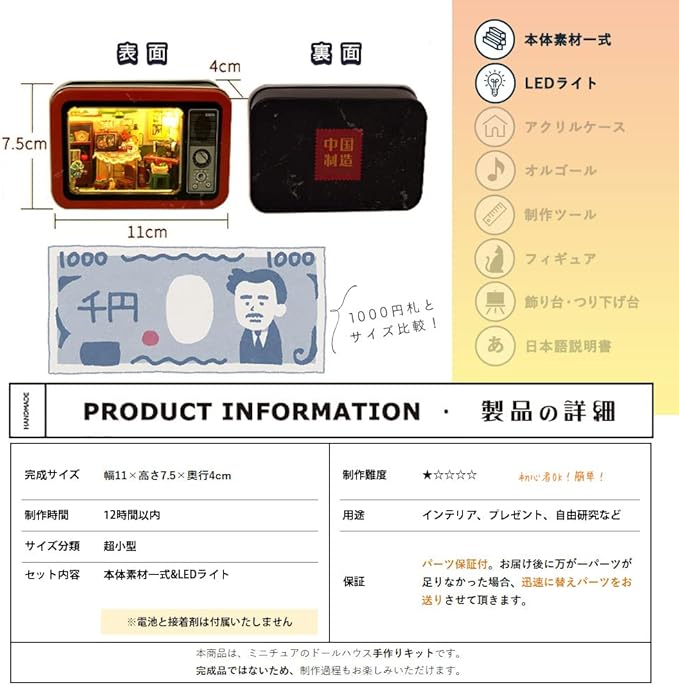 【完成サイズ】 幅11 高さ7.5 奥行4cm 【サイズ分類】 超小型 【制作時間】 12時間以内 【制作難易度】 ★☆☆☆☆(初心者OK!簡単!) 【セット内容】 素材一式&LEDライト 【保証】:パーツ保証付。お届け後に万が一パーツが足りなかった場合、迅速に替えパーツをお送りさせて頂きます。