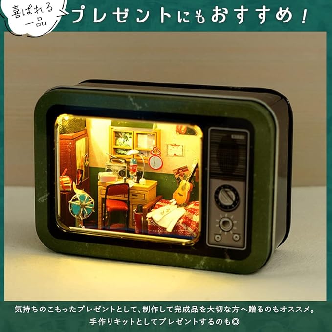 moin moin ドールハウス ミニチュア 手作りキット セット 手のひらサイズ 缶 小物入れ 昭和 TVの中 和風 レトロ テレビ 型 グリーン 実家の自分の部屋 | LEDライト 2110dh297 | KAZESHOP