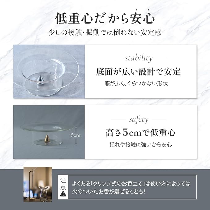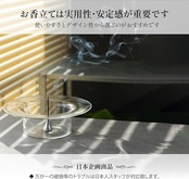 【安全設計で安心】 クリップ式ではないため、お香がはじけ飛ぶ心配がなく、安全性が高い設計です。燃焼中も安定感抜群で、どなたでも安心してお使いいただけます。