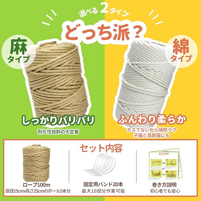 【ボリュームたっぷりセット】 100mの太いロープで爪研ぎポール5~8本巻き付けることが可能。さらに、固定用バンド20本付きなので最大10回分の作業が可能。初心者でも安心な巻き方説明書付きです。