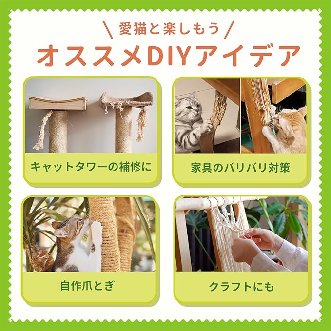 【活用シーン】 キャットタワー補修(キャットタワーリペアロープ)、自作爪とぎ、家具の爪とぎ対策など幅広く活用可能。猫ちゃんとの暮らしをもっと快適にするおすすめの猫グッズです