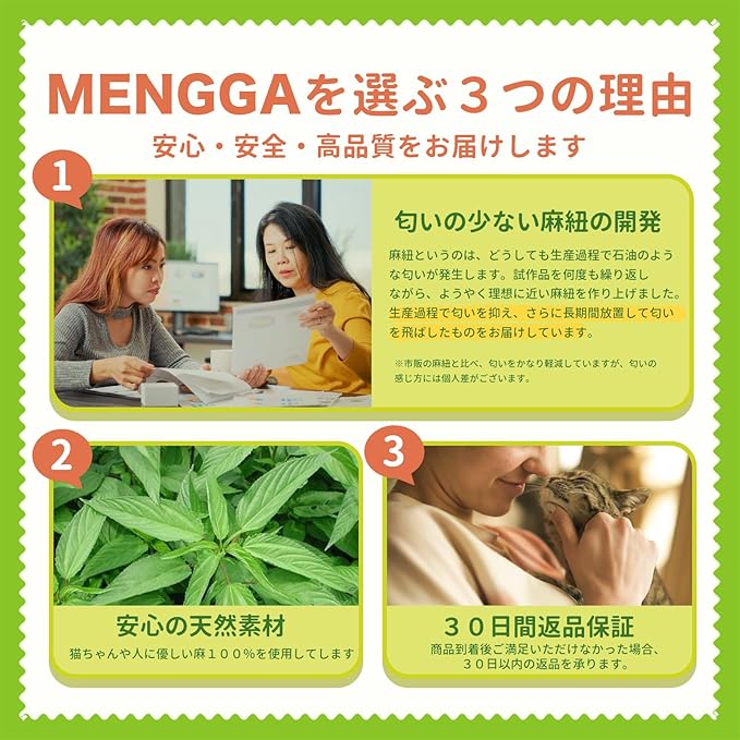 【こだわりの品質】 何度も試作を重ね、理想に近いロープを作り上げました。素材にこだわり、猫ちゃんのために、そして飼い主さんのために丁寧に作りました。