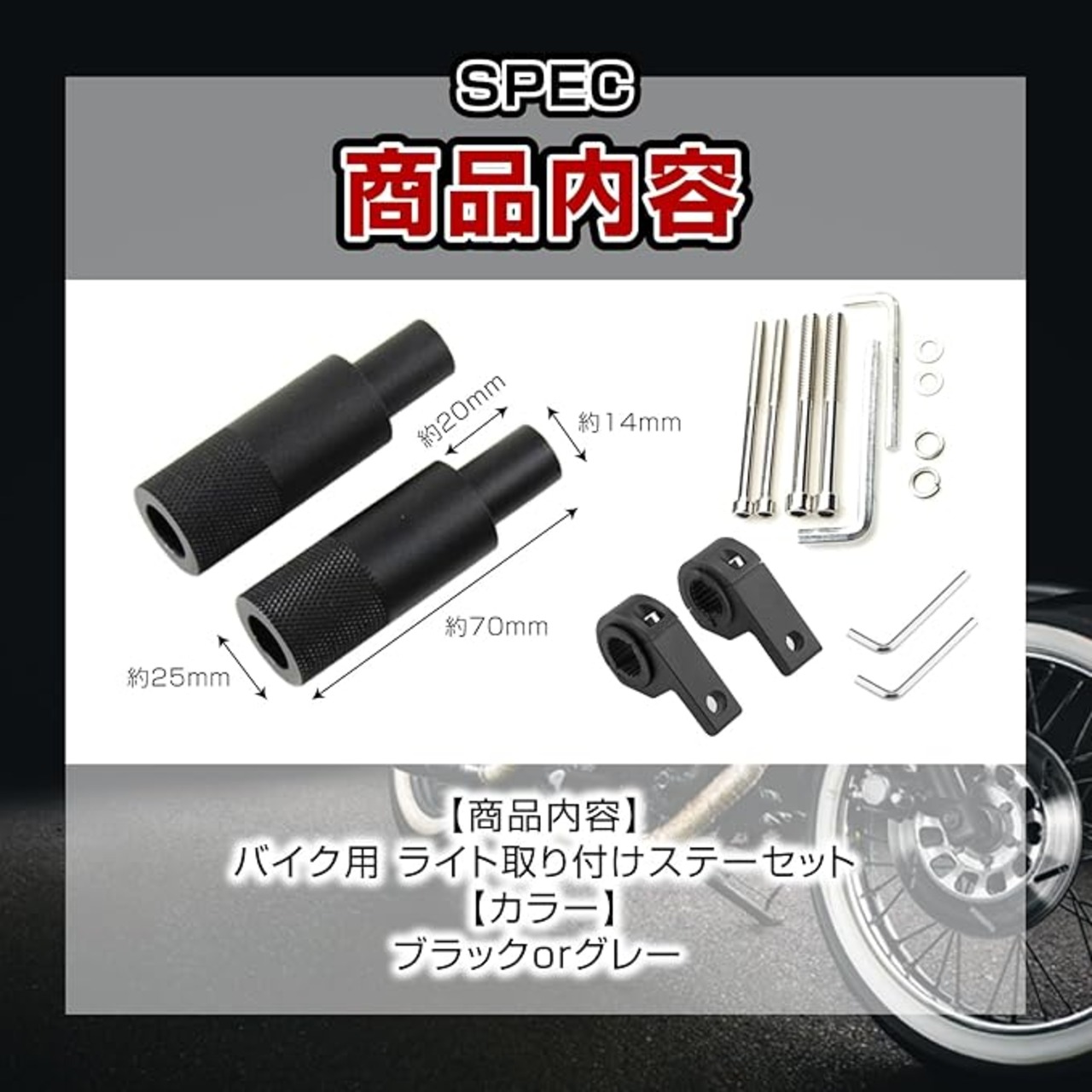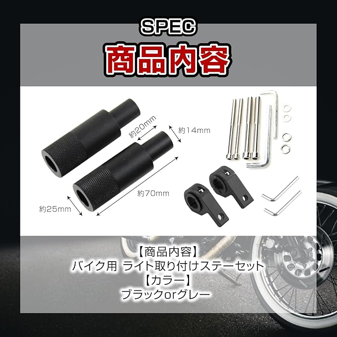 ※取扱説明書は付属しておりません。【商品内容】バイク用 ライト取り付けステーセット(ブラックorグレー)【セット内容】】取り付け用ステー 2個、M8規格のボルト 2本(長さ:約87mm)、M6規格のボルト 2本(長さ:約85mm)、スクリューワッシャー合計4個、ライト固定用ステー 2個、太さ調整用ラバーパーツ 2、スタンド用ネジ、六角レンチ 2種【カラー】ブラックorグレー ※モニターの環境により、色の見え方に若干差が生じる場合がございます。