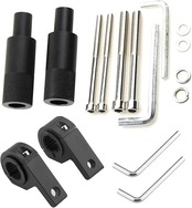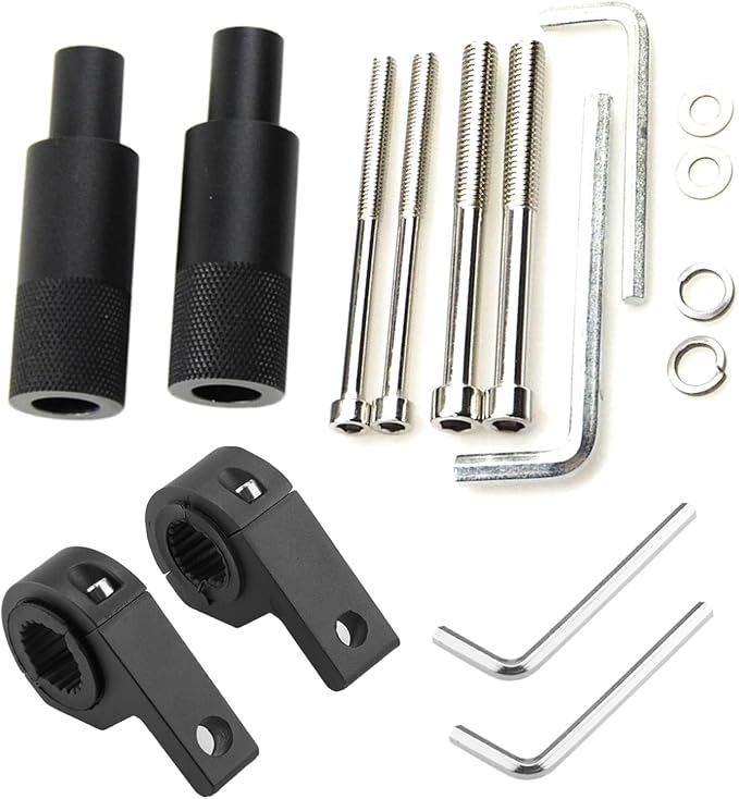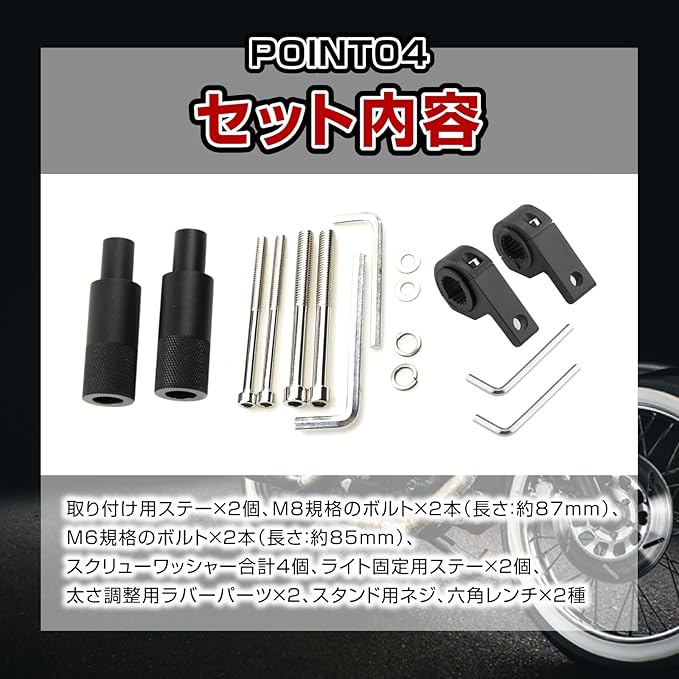 【セット内容】取り付け用ステー 2個、M8規格のボルト 2本(長さ:約87mm)、M6規格のボルト 2本(長さ:約85mm)、スクリューワッシャー合計4個、ライト固定用ステー 2個、太さ調整用ラバーパーツ 2、スタンド用ネジ、六角レンチ 2種
