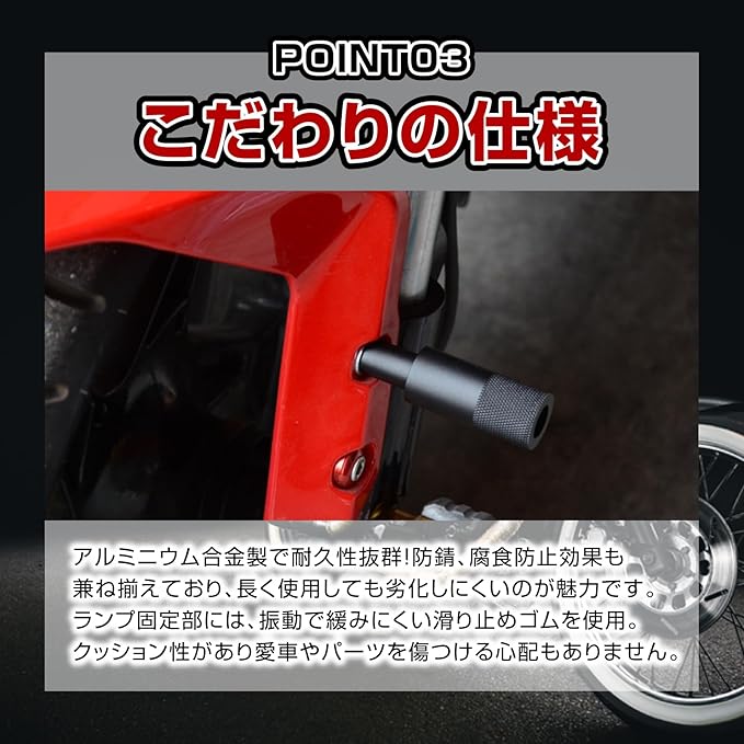 【こだわりの仕様】アルミニウム合金製で耐久性抜群!防錆、腐食防止効果も兼ね揃えており、長く使用しても劣化しにくいのが魅力です。ランプ固定部には、振動で緩みにくい滑り止めゴムを使用。クッション性があり愛車やパーツを傷つける心配もありません。