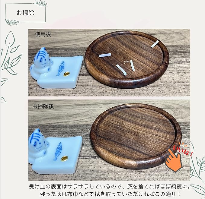 受け皿が灰が散らばりにくくしてくれます。天然の木を使い、すべすべとした仕上がりなので、お手入れも楽ちん!