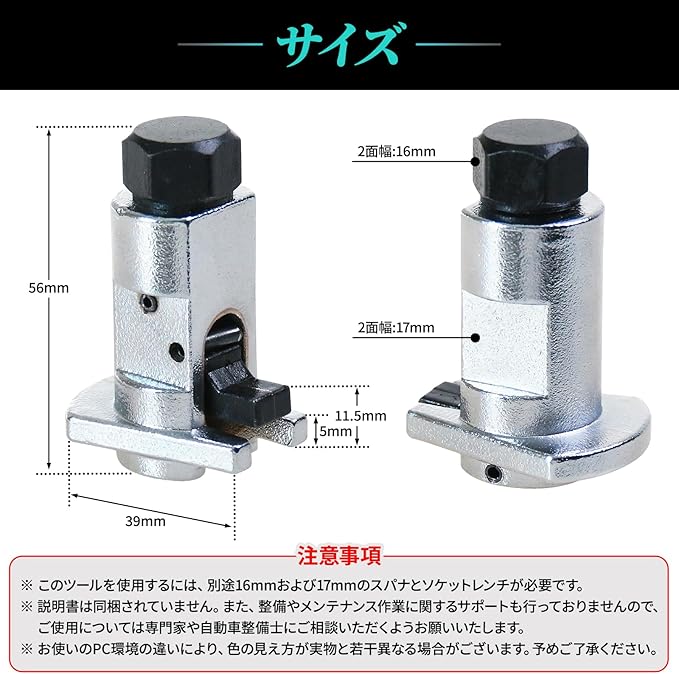 ✅ 必要な追加アイテム: このツールを使用するには、別途16mmおよび17mmのスパナとソケットレンチが必要です。これらのツールを用意することで、作業を円滑に進めることができます。