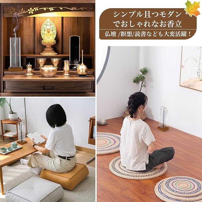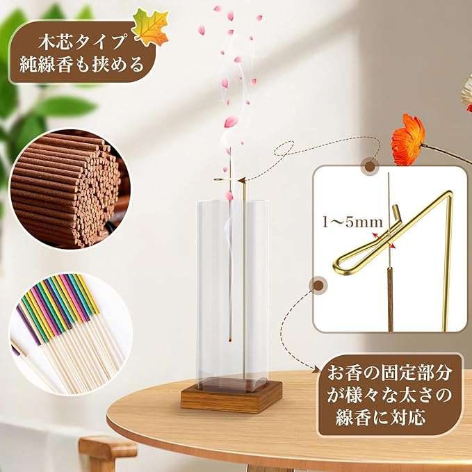 【お香立て おしゃれ インテリア】満々の北欧風デザインでおしゃれです。透明で美しくガラスと木目調を組み合わせて作られた、モダンな雰囲気で、和室にも洋室にも合うお香立てです。インテリアとしても飾られ、和やかな雰囲気を与えられます。自宅、旅館、仏堂、茶室、会所、図書館、瞑想室、ティーハウス、オフィス、リビングルーム、ヨガなどで、さりげなく香りがする場合に広く使われています。空気を浄化するだけでなく、疲労を和らげるだけでなく、健康と気分を改善します。年齢、性別を問わずお使いただけるインテリアなデザインは、友人や家族への贈り物に最適です。オススメの一品です。特別な日のギフトにも最適です。