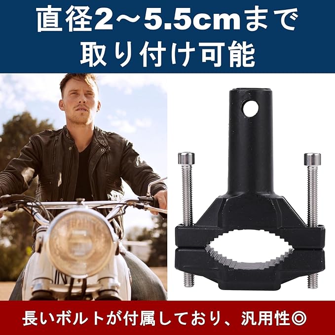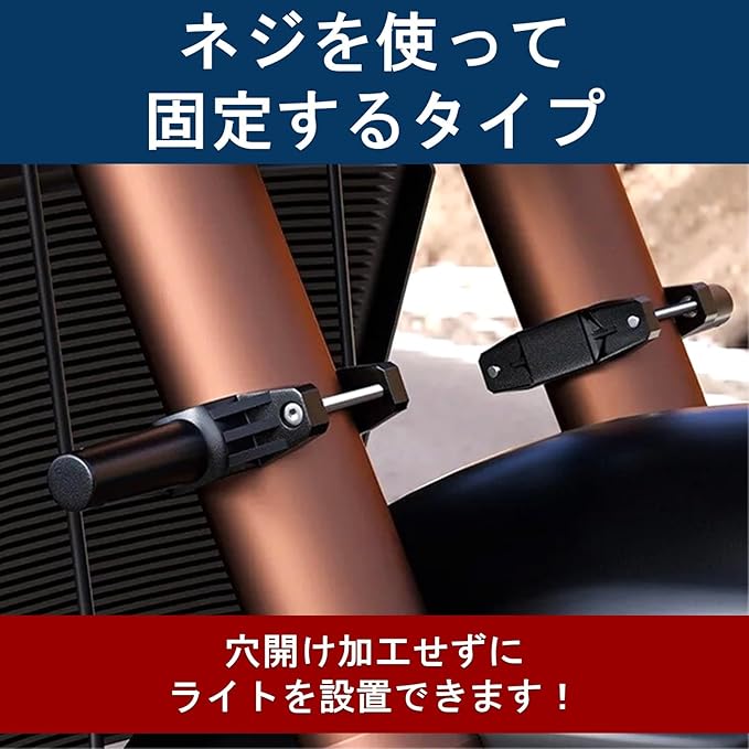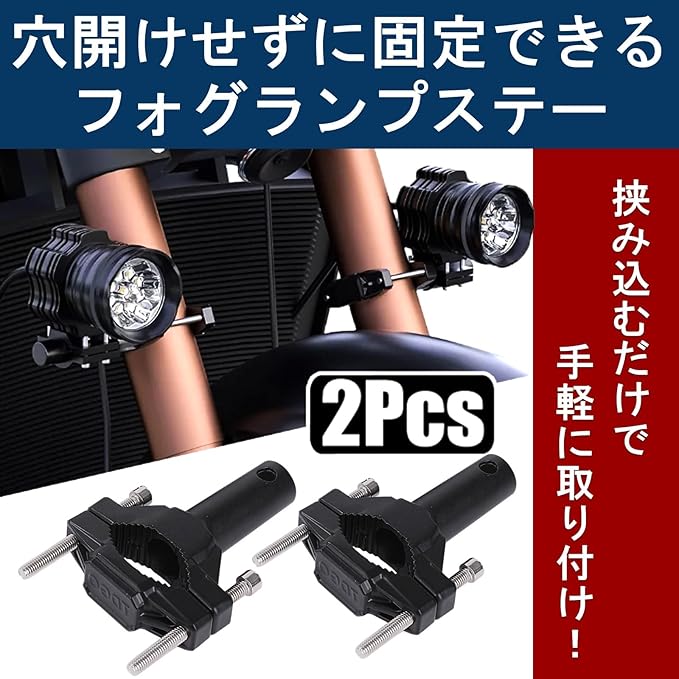 穴開け加工せずに固定できる、フォグランプステー2個セット。長いボルトが付属しており、直径2〜5.5cmまでのステーを簡単に取り付けできます。