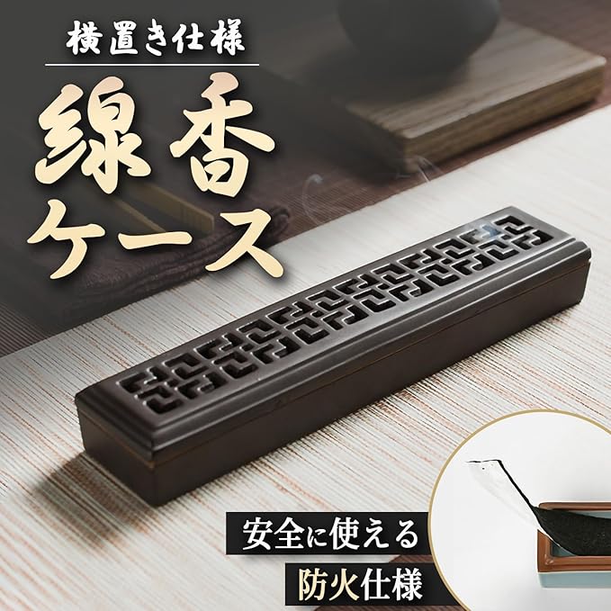 防火シート付属で安全:ケース内部底面には耐熱・断熱性に優れた防火マットを敷いています。線香を最後まで燃やしても受け皿が高温になりにくく、下に敷く台や家具を焦がす心配がありません。横に寝かせて使用するため線香が倒れる危険性もゼロ。火種が露出しない蓋付き構造と相まって、小さなお子様やペットがいるご家庭でも安心してお香を焚いていただけます。