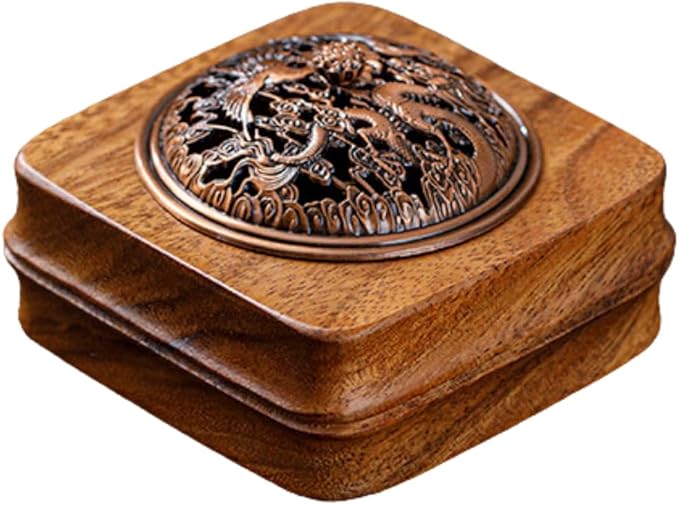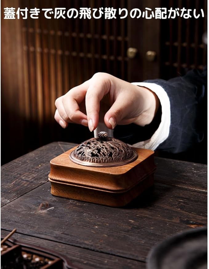 【製品仕様】内容:お香立て、銅蓋、不燃シート 適用:渦巻き香/コーン香 サイズ:約10x10x3.5cm 内径:7cm 材質:胡桃木製、銅 バリエーション:龍と鳳凰、ストライプ、竹編み(古銅)、竹編み(青銅)